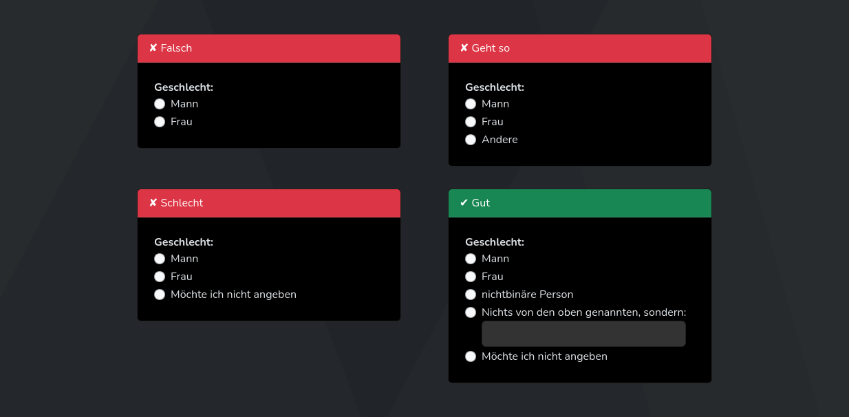 - Inklusivität – dass wir keine Annahmen treffen über die Geschlechter von Personen, die wir nicht kennen, und sie dadurch ausschließen.