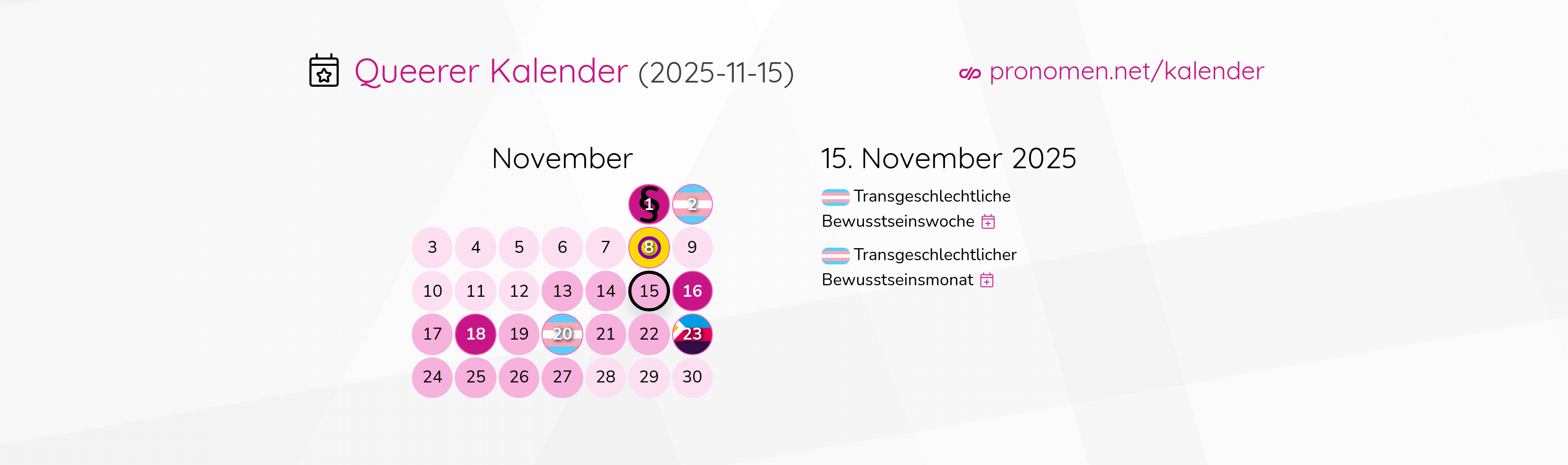 Beschreibung der Flagge: Eine rechteckige Flagge mit fünf gleichbreiten, horizontalen Streifen: Blau, Pink, Weiß, Pink und Blau. Transgeschlechtlicher Bewusstseinsmonat