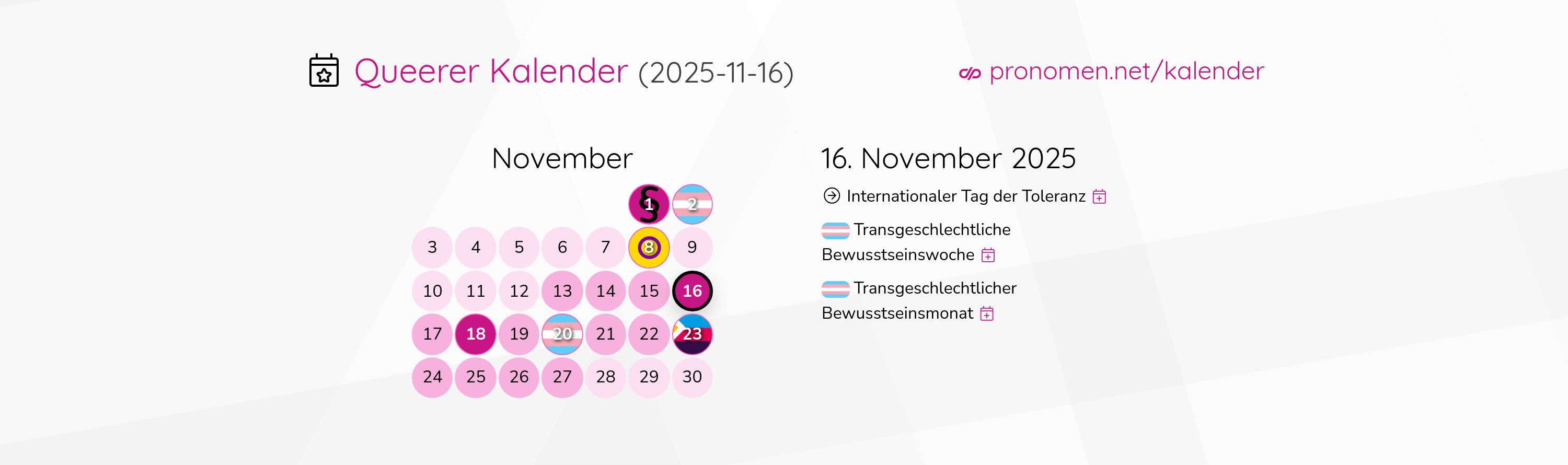 Beschreibung der Flagge: Eine rechteckige Flagge mit fünf gleichbreiten, horizontalen Streifen: Blau, Pink, Weiß, Pink und Blau. Transgeschlechtlicher Bewusstseinsmonat