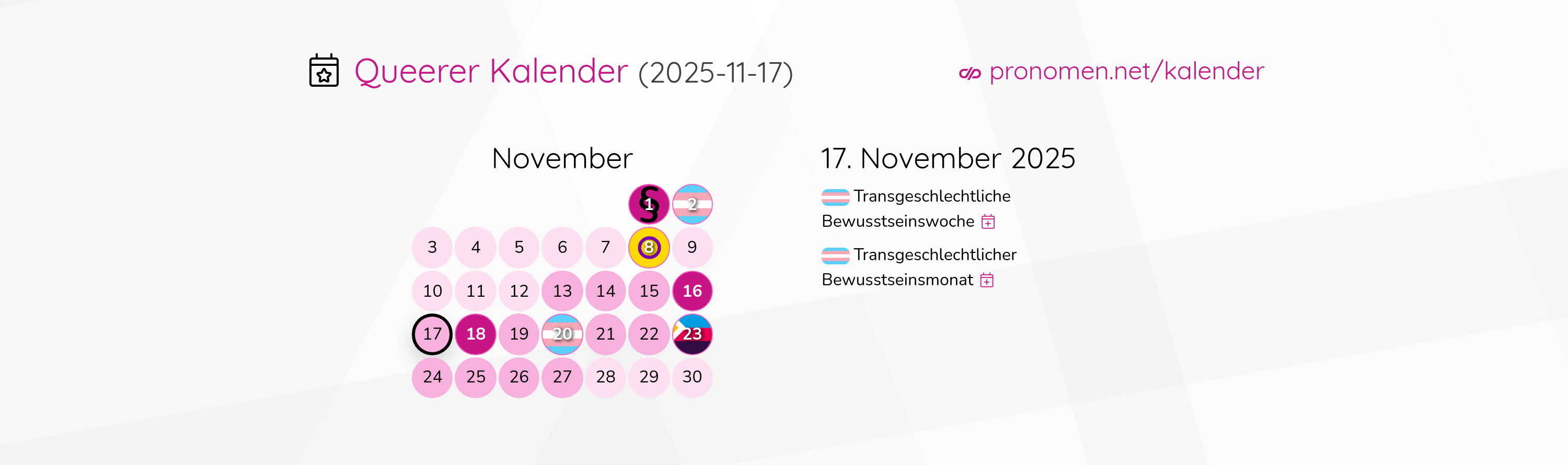 Beschreibung der Flagge: Eine rechteckige Flagge mit fünf gleichbreiten, horizontalen Streifen: Blau, Pink, Weiß, Pink und Blau. Transgeschlechtliche Bewusstseinswoche